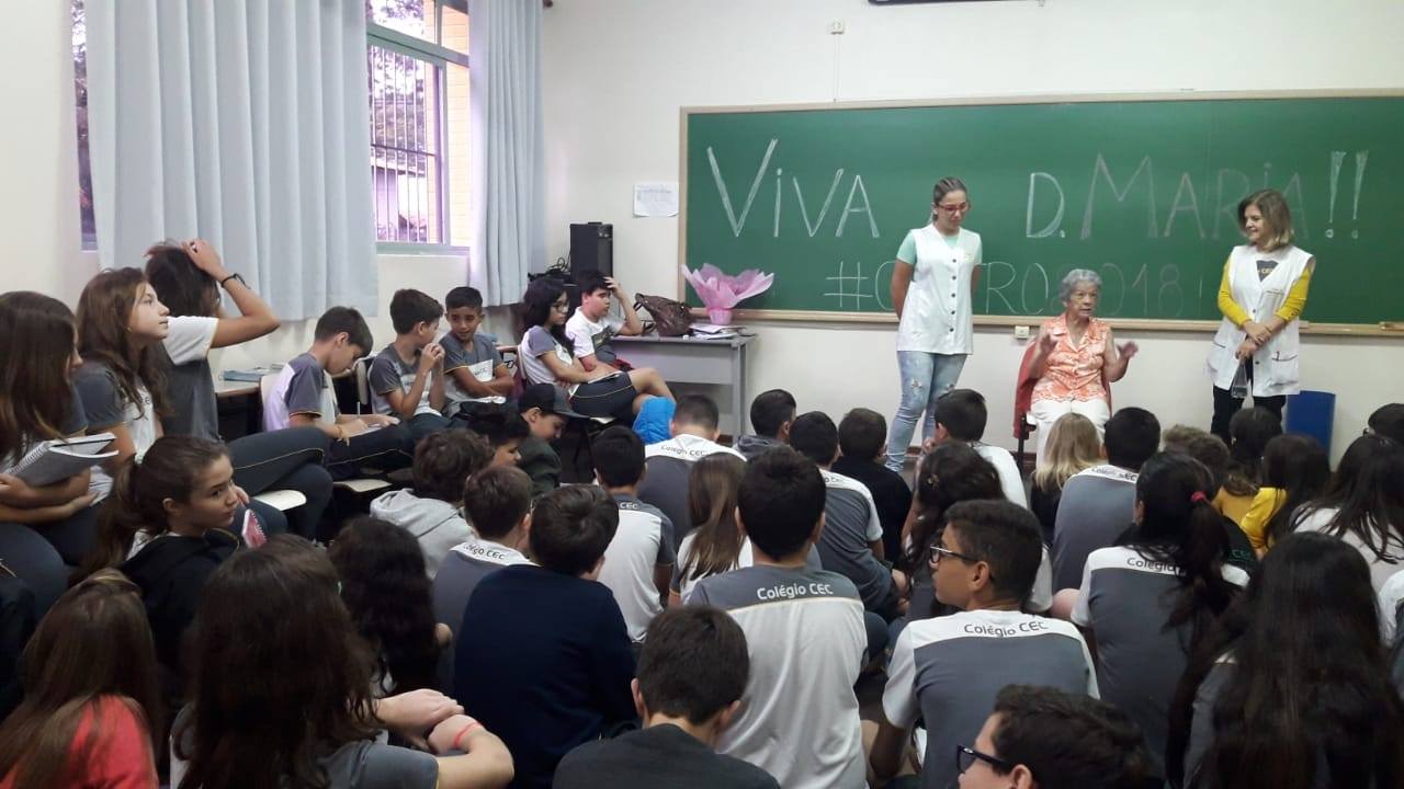 Os alunos do Colégio CEC receberam nessa semana a visita de D. Maria Bueno Bourguignon uma moradora pioneira da cidade de Castro que veio gentilmente falar sobre a cidade e sua colonização. O Projeto Intercâmbio Cultural foi finalizado com a viagem de nossos alunos para Castro.